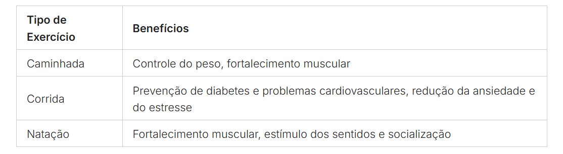 Tipo de ExercícioBenefíciosCaminhadaControle do peso, fortalecimento muscularCorridaPrevenção de diabetes e problemas cardiovasculares, redução da ansiedade e do estresseNataçãoFortalecimento muscular, estímulo dos sentidos e socialização